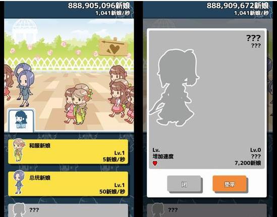 2、点击一下才有一位新娘实在太慢了,还好可以升级“登记结婚(应该是翻译问题,意思应该是结婚证)”,拥有越高等级的“登记结婚”每一次点击就能产生更多的新娘