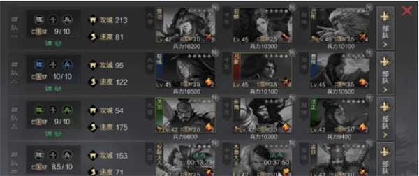 3、组建部队:队伍中国古代传统战法分为大营、中军、前锋,不同武将在各自位置都有着不同作用,队伍编制融入了比较强的策略元素。
