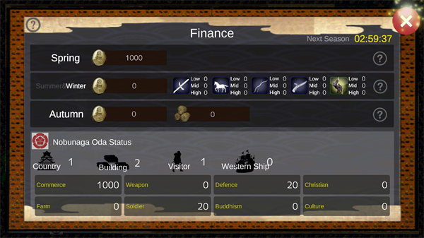 武士战争(Samurai)是zeimoter开发的一款日和风格的策略塔防类游戏。武士战争以日本战国时代为背景,讲述了一个武士军阀,指挥你的部队在战场上,使用战术技能打败敌人,统一日本,充满挑战和乐趣的武士战争绝对会让你度过美好的一天!玩家可以在游戏之中发展属于自己的战国风云时代,不断获取更多的资源,和周围的国家展开外交或者战争,并且通过发展内政、与他国外交,不断提升自己的国力吧!