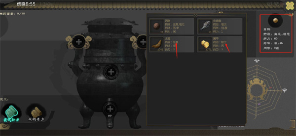 3、药味:这个属性就比较有意思了,也算是大多数大侠可能不是很理解的点,每种药材都有药味,有些药材更是有两种味道,但药材之间的药味是可以做到相互抵消的,这也就是为什么有的丹药目标是无味的。其中甘对应苦,酸对应辛,举例说明:在不考虑其他炼丹目标只考虑味道的情况下,葛根味苦,甘草味甘,我每种草药放入一个,两种味道对冲,那么他就是无味的,如果葛根2个,甘草1个那他就是苦的。说这么多那么接下来我们炼制一个丹药试试,以“洗髓丹”为例:背包内药品以上两种满足药效刚好炼制,目前目标药力是60,我们所需的药品每个是3,计算后药品总数量需要20个,我们可以添加水蛭*10和黄芩*10(反正搭配起来是60药力就可以了,不用数量对称,药力高于目标值也是可以的)成功之后您的目标与当前就会变一致,丹药的图标也会正确的显示,此时放入药材后加入木材就可以开始炼丹了。如果放入东西符合目标需求但图标还是没有变更为目标丹药那我们就要想想是不是这个丹药炼制需要药引了。丹药炼制的过程我们已经说完了,其实了解过程和药材的属性就不是很难了,每种丹药的炼制可能有很多种不同的搭配。每次我们成功炼丹后都会储存在我的丹方中,下一次想要炼制时可直接点击就行了。