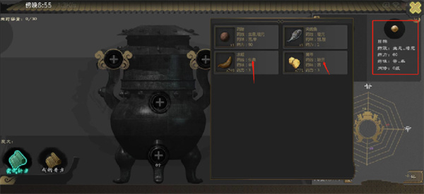 点击炼丹炉使用进入炼丹界面,左下方尝试新方新手炼丹师必备,可以帮助你清楚地知道炼制这个丹药需要哪些丹药属性选择丹药后会发现右侧目标的变化。我们来说一下炼制这个丹药的需求。