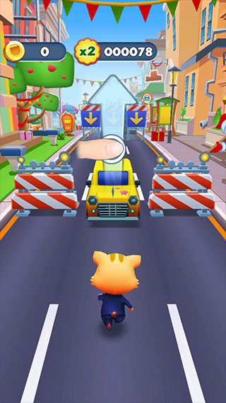 2、进入关卡赚取金币来装饰小家,向上滑动猫咪跳跃汽车障碍。