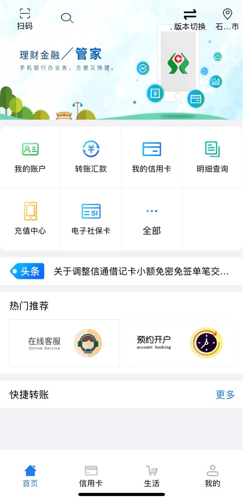 首次使用河北农信手机银行需要输入用户名和密码进行登录,之后再次登录,无需输入,直接进入到“首页”界面;