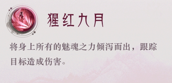 三技能:猩红九月:将身上所有的魅魂之力倾泻而出,跟踪目标造成伤害。