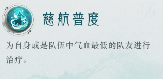 二技能:慈航普度:为自身或是队伍中气血最低的队友进行治疗。