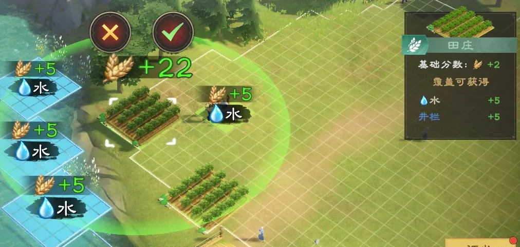 2、最低级的绿色建筑村庄和伐木场只有摆放在地图上木头和水旁边才有额外加分。每一块区域的水和木头都是固定数量固定位置的。