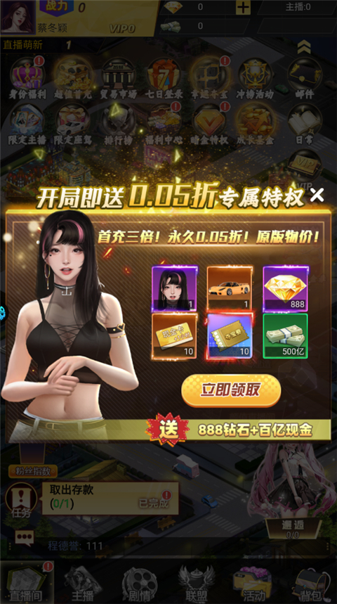 3、0.05折福利,女神主播免费领,每日登录即领取,通关主线轻轻松松。
