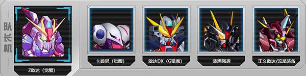 队长机量子型00敢达全刃式+敢达DX(G猎鹰)+再生敢达+敢达AGE-FX+强袭自由敢达:适合新手培养,输出主要靠高星强袭自由,其余机体均具备减能、沉默、瘫痪效果,能够快速争取战场主动,外加多重增益技能效果,3星就可发挥作用。