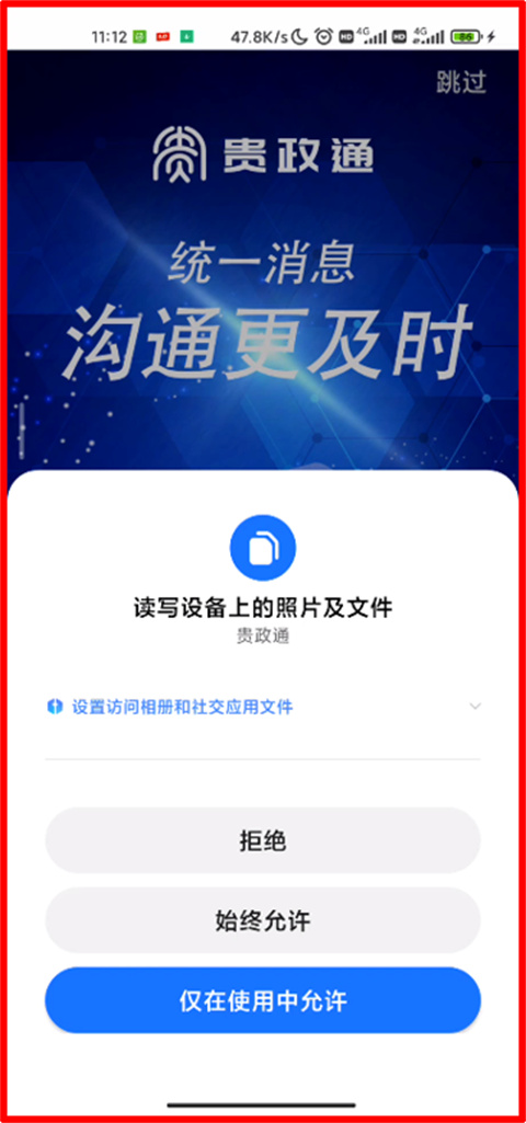 1、首先打开贵政通app,点击“仅在使用中允许”,必须打开权限哦!