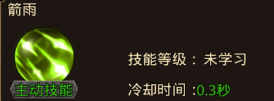 1、箭雨(主动技能):神射手群体攻击箭术,向目标区域射出大量箭支,对范围内最多6个目标造成伤害并且附加流血效果。