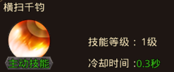 1、横扫千钧(主动技能):猛将群体攻击招式,轮起武器横,扫自身前方扇形范围内最多6个目标。