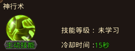 2、神行术(主动技能):神射手增益技能,增加自身移动速度,持续5秒,附加聚能效果:下次攻击伤害增加。