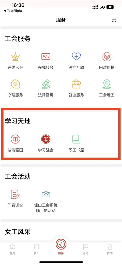 1、包括工会服务、学习天地、工会活动、女工风采四个栏目设置,能让职工一键触达维权服务类、教育培训类、工会活动类、职工文体类、金融支撑类等工会服务。