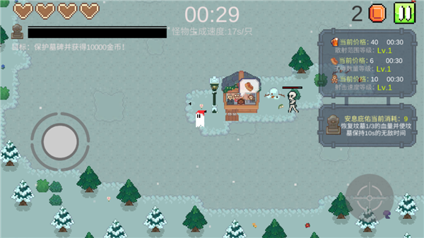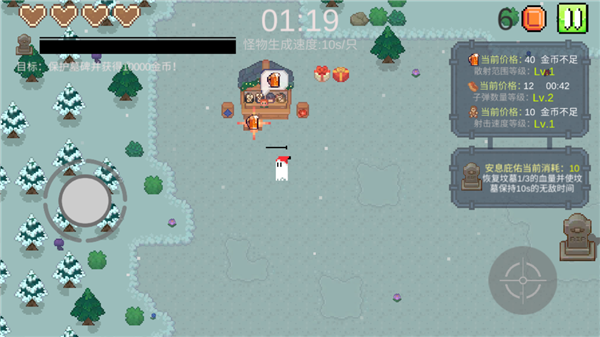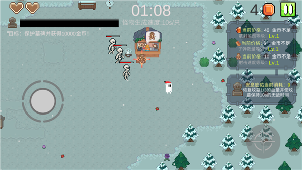 这款叫《一万金币》的手游看起来挺有意思的,是个像素风格的动作防御游戏。你扮演一个小幽灵,主要任务就是保护一个墓碑,不让僵尸们把它毁掉。游戏里有各种武器和道具可以买,比如弓箭、炸弹什么的,还能用姜饼人提高射击速度,或者用热狗多射子弹,甚至还有啤酒能扩大范围!战斗节奏挺紧张的,得靠反应力和策略才能守住墓碑。