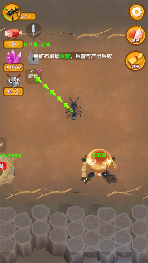 1、双击打开蚂蚁大冒险游戏,首先我们把蚂蚁拖动到【解锁】这两个字上,用矿石解锁兵营,兵营可以产出兵蚁;