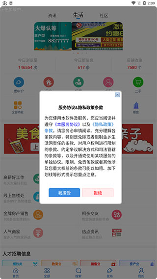 1、首先下载安装金乡生活网,点击打开软件,进入首页,在进入首页后会出现相关的协议,需要同意后才能正常使用软件。