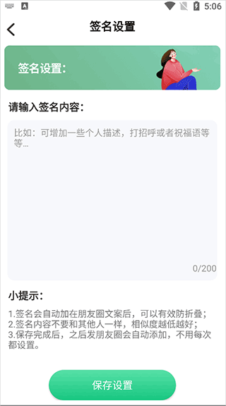 2、然后,在这里输入签名内容后,点击保存设置按键;