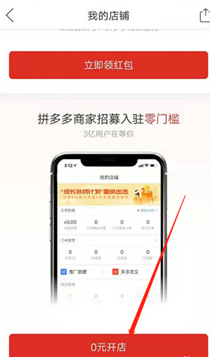 3、在我的店铺界面,点击“0元开店”;