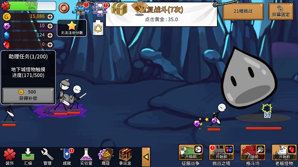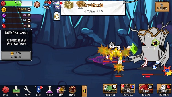 卡通传说是一款由Honeydew 1853开发的一款角色闯关类游戏,游戏画风正如代表名称一样,简约的火柴人角色将在你的帮助下开启无止境的征战之旅,其中为了壮大城镇的威名,你需要不断招募新的冒险者前往副本关卡挑战极强Boss,同时该游戏还有简单的模拟建造玩法,为了能够招募不同种类的士兵,你需要建造对应的建筑方可自动进行,但前提是小镇的繁荣度必须达到一定的条件才可完成建造。另外,在卡通传说游戏中还结合了模拟建造与地下城闯关玩法,可让游戏亮点变得愈加鲜明,并作为一款火柴人系列的角色策略游戏,游戏中除了模拟建造,还包含了角色养成,征服战争,挑战之塔、格斗场、boss怪物等多种玩法系统,独特风格的角色闯关体验,势必让你眼前一亮,别忘了及时的收集各种丰厚奖励哦!
