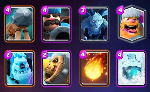 这套冰火三冲卡组的进攻思路是以冰冻配合攻城槌冲击对手的防御塔,不同于墓园卡组的“一波流”,这套卡组的瞬时爆发并没有那么高,更多的时候需要想先稳固防守,静待最佳的进攻机会。相较于冰冻墓园,使用这套卡组,对冰冻法术释放时机的选择更加重要。