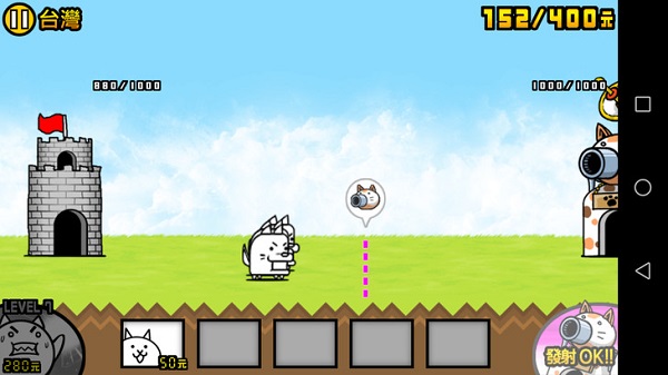 游戏目标是攻占在另一端的地方堡垒,玩家可以选择花费50元生产一个猫咪士兵,也可以用40元升级堡垒,加快金钱速度。右下角的猫咪炮是需要通过士兵的攻击来蓄能的,一旦蓄能完成,就会出现一个可供打击的区域,瞬秒区域内的所有敌人,是不是很厉害呢。