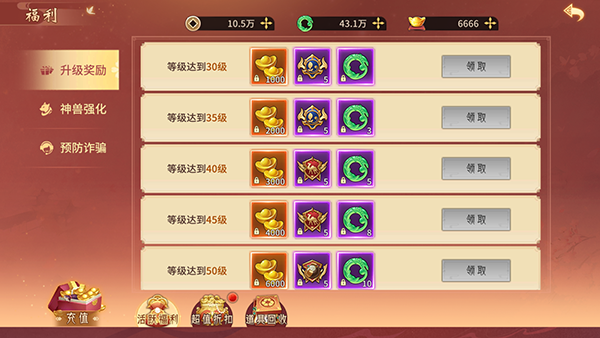 3、升级奖励:玩家等级达到指定等级还能领取到丰厚奖励。