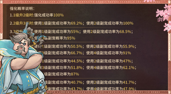 (千万不要盲目的相信你自己的运气!一定要相信概率!因为这是小编血的教训),高级的宠物一定要把拿来强化的材料宠物也强化到高级一些后再去强化,不然成功率太低性价比也就低了。一般建议概率在65%以上便可冲了。