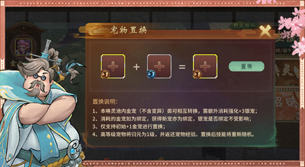 但是千万要注意的一点是,多出来的银宠、普通宠都不要放生!他们也都大有用处!在宠物唤灵的界面中有一个置换宠物的选项,在这里,强化到+3的银宠加任意一只+1的金宠便可以置换一只你心仪的别的金宠,咱们可以集中精力资源先优先培养起一只拥有即战力的宠物,在前期唤灵的祈愿栏还有置换中都选择同种宠物便可方便强化。