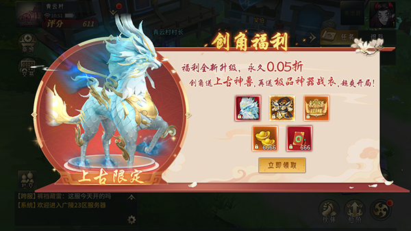 1、创角福利:创角送上古神兽,再送极品神器战衣,超爽开局!