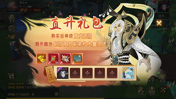 2、直升礼包:等级直升35,且额外赠送40级强力紫装和大量灵玉。