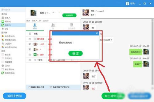 3、之后找到微信一栏点击可以看到需要恢复的微信号,点击需要恢复的微信号之后查看详情就能看到里面的数据了,在这些聊天记录中就可以找到要恢复的并且对其进行勾选出来,然后点击【导出选中记录】之后对聊天记录进行恢复。