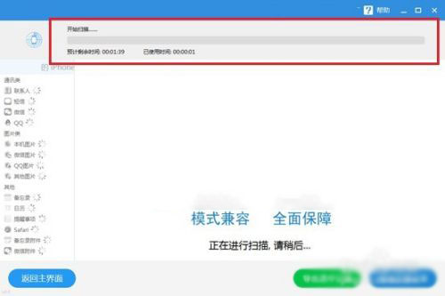 2、软件开始扫描之后就会开始对手机里面的数据进行扫描,然后等待软件的扫描完成就可以在软件的界面上看到已经扫描出来的数据了,扫描的时间长度跟手机里面数据有关系,也就是手机数据越多扫描时间越长。