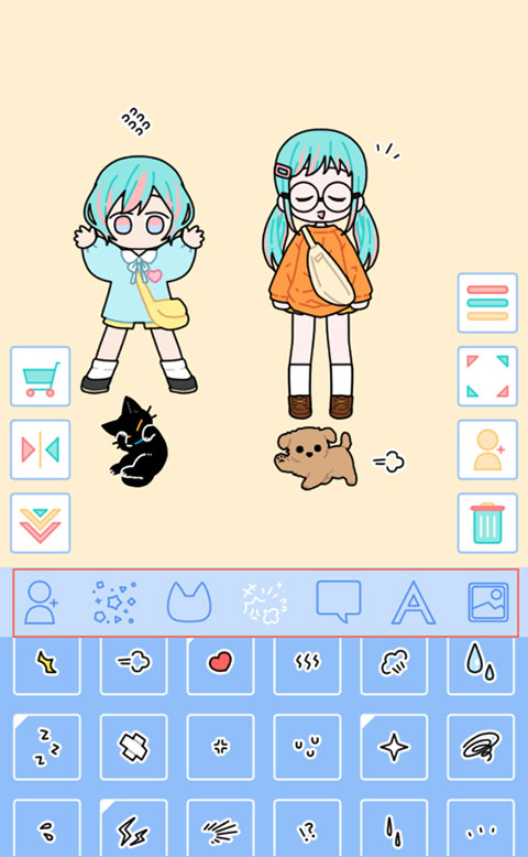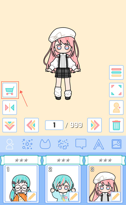 4、进到页面先点击下方的已经搭配好的女鹅将她放到屏幕上,再次点击下方的女孩可以添加多个角色到屏幕中。长按可拖动角色,往下滑至垃圾桶按钮可删除角色。返回主界面的话只需点击右方第三个按钮。