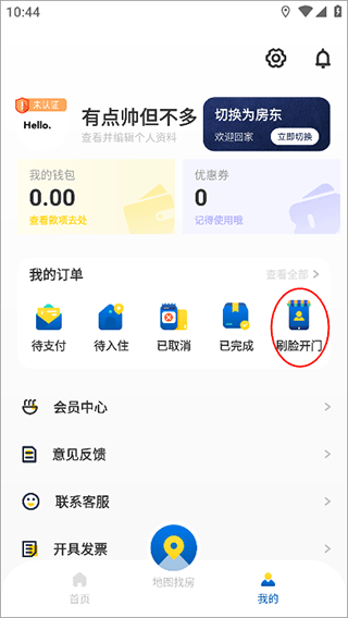4、到了房源位置后可点击我的,在我的订单中点击刷脸开门即可入住