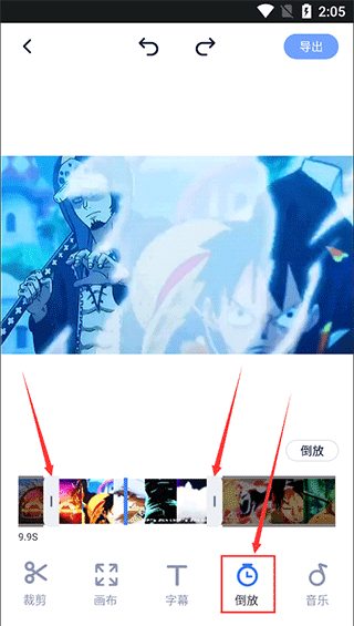 4、在视频编辑页面下方,我们能看到【裁剪】、【画布】、【字幕】【倒放】、【音乐】等功能,我们选择【倒放】功能,然后按照自己的需求调整视频的时间轴