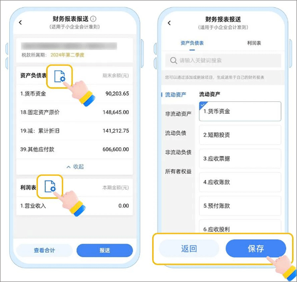 2、点击资产负债表及利润表后方的设置按钮,可勾选本期财务报表报送虚填报的项目,点击保存后回到填报界面;