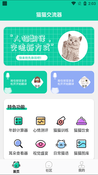 你知道你家猫又不吃饭的原因吗?你知道你家猫为何不理你吗?猫猫交流器可以告诉你,这是一款为喜爱猫猫的小伙伴们专门设计开发的软件,功能丰富且有趣,在这里,你能通过特色功能、猫猫百科知晓并全面了解养好猫咪的所有知识和经验,通过社区交流你可以知晓其它养猫人的心得与快乐。