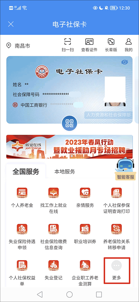 4、接着在电子社保卡界面往下滑动,在全国服务当中找到并点击“更多”选项;