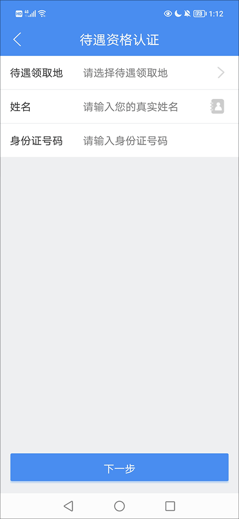 4、接着,在待遇认证当中选择好待遇领取地、姓名、身份证号码后找到并点击“下一步”选项;