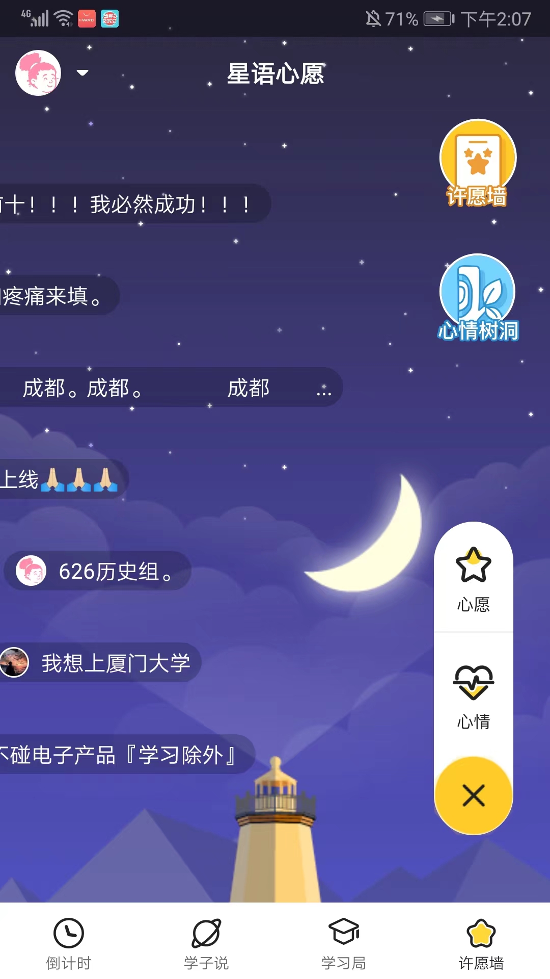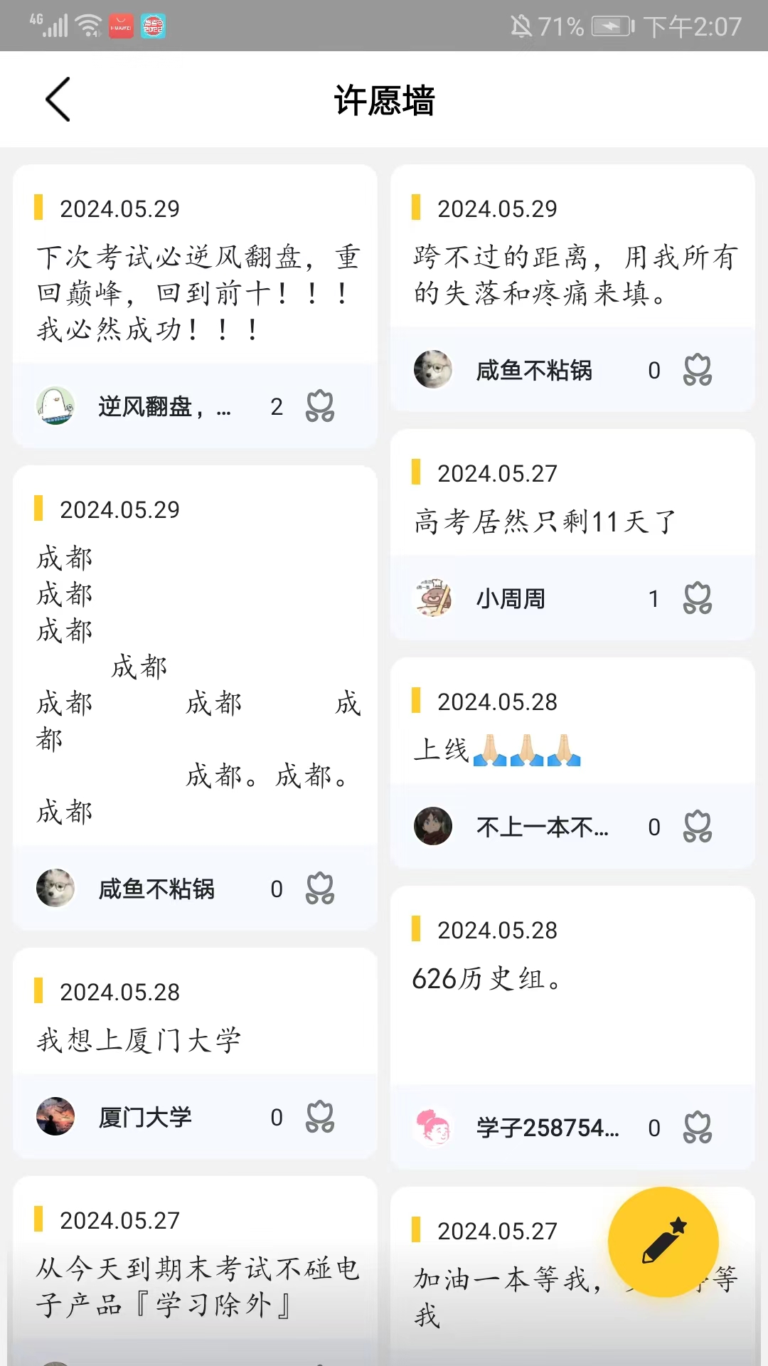 在这里既能发帖子和来自各地的学生分享,又能进行许愿,解放身上的压力。