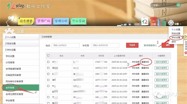 如果您没有设置密保邮箱和密保问题,或者不慎将自己的帐号也忘记了,此时找回密码,就需要借助第二个人的力量了。如果您是教师:学校管理员可以按照教师的姓名查找教师的帐号,并为教师重置密码(管理员操作方法如下图)。重置后的密码是:666666,完成密码重置的教师尽快登录个人中心重新设置新密码。