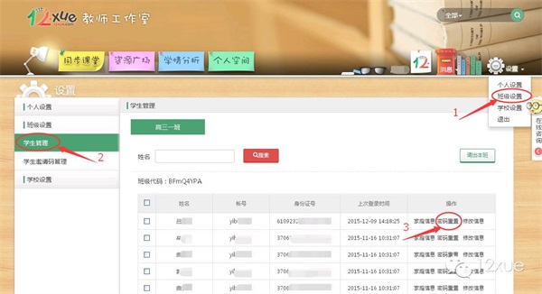 如果您是学生:班主任可以查看学生帐号,并为学生重置密码。班主任的操作方法如下图。密码重置后为:666666