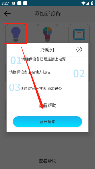 设备页面点击“添加设备“->选择 “冷暖灯”->点击"蓝牙搜索",开始添加设备,添加完成后,对扫描到的设备进行分组。
