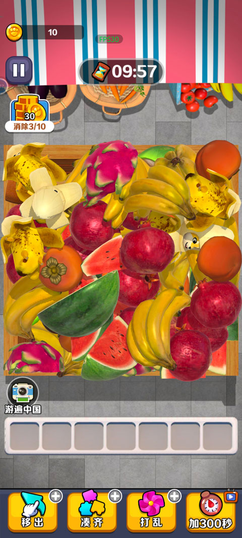 2、具体操作就是三个相同的货物,放在下方格子里即可成功消除;但是像半片西瓜与一瓣西瓜,即便是同类、但因为不同,也不能成功消除。
