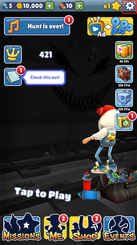 1、双击打开地铁跑酷沙漏版游戏,先点击右上角的齿轮图标。