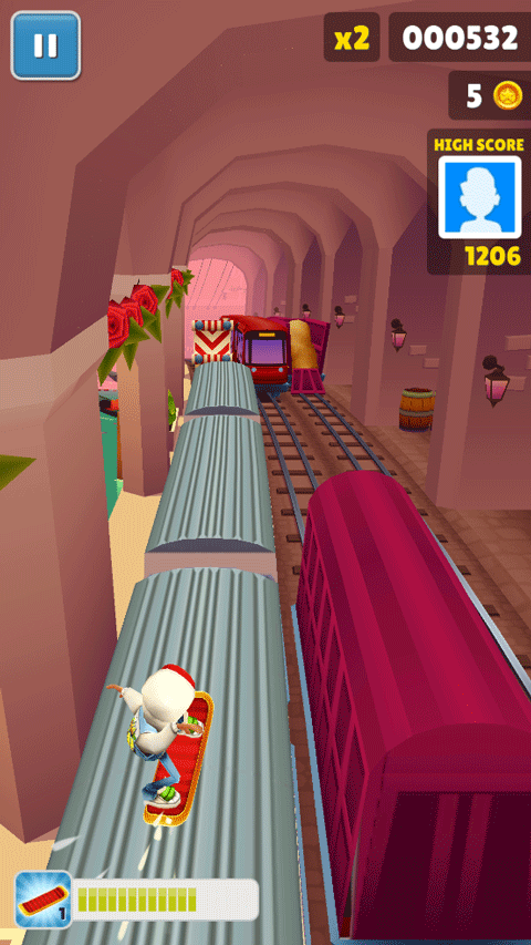 4、随机应变沉着应对,学会默数滑板的消失时间,以及优化跑酷路线(何时放开的捡道具、游戏币,何时选择安全路线为主)不要顾此失彼。