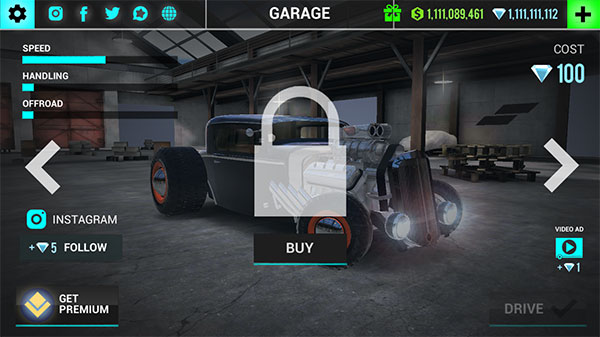 1、首先进入游戏可以通过左右滑动来更换汽车,一辆好汽车是比赛获胜的关键