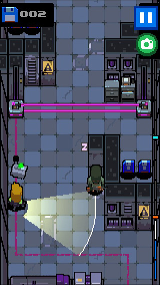 这款游戏有种与士兵躲猫猫的感觉,只要躲避好士兵的巡查灯和监控,绕道而行就能过关了,也可以与士兵正面对抗,将它们打晕就可以走过去了…(正面对抗不是指,迎着它们的灯光打它们,主要就是绕后迎着灯光一下子就死了,这个要非常注意…)游戏通过点击可以出现行走的路径,一定要利用好这个路径,尽量躲避灯光和摄像头