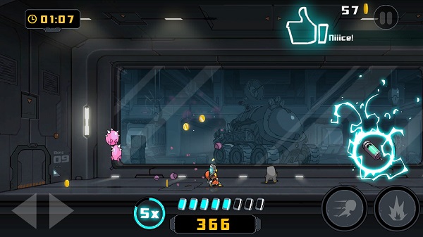 画面采用卡通风格,配合快节奏的射击和爆炸动画,让整个游戏过程充满刺激感。玩家需要灵活运用冰冻光线、飞镖等高科技手段击落敌人,并在过程中解救被困科学家。虽然一开始看起来简单,但随着关卡推进,难度逐渐提升,充满了挑战性。