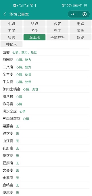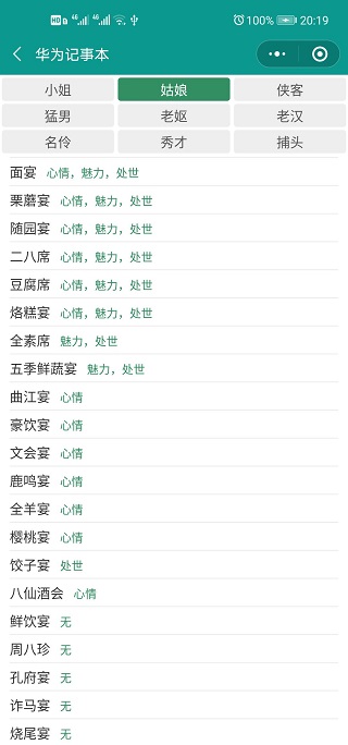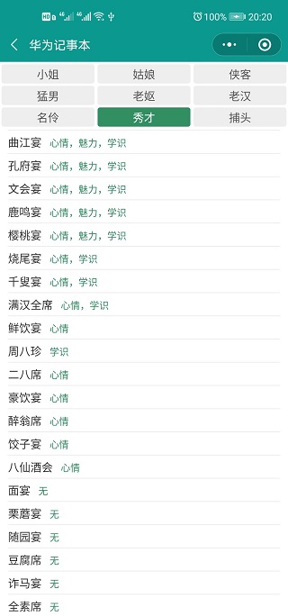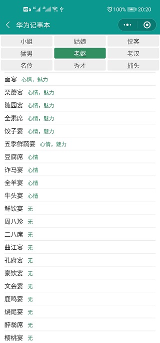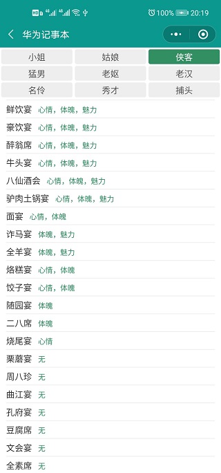 每个NPC喜好的宴席不同,加的属性也不同。请的宴席对口,那么角色加的属性也更多。(测试发现猛男经常会导致体魄下降)。下面提供每个NPC喜好的宴席,供参考: